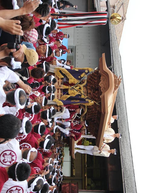 堺町交差点の歩道橋から眺めれば、鮮やかなえんじ色のハッピが、地車を中心に、一筋のリボンのように。