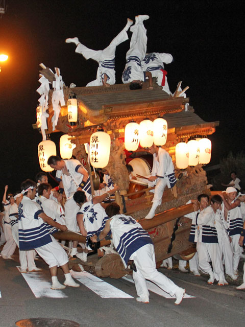 この神社の夏祭りには、子供みこし・枕太鼓が巡行し、そして一台の地車が曳行されています。