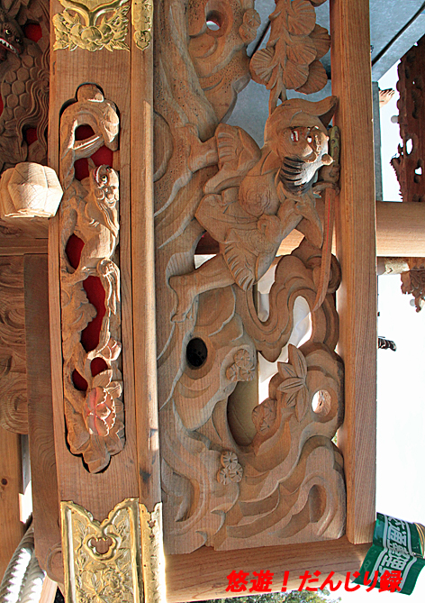 この上ケ田南垣内のだんじりの場合は、『退治物三場面』が彫り込まれていて、どれも迫力のある作品。