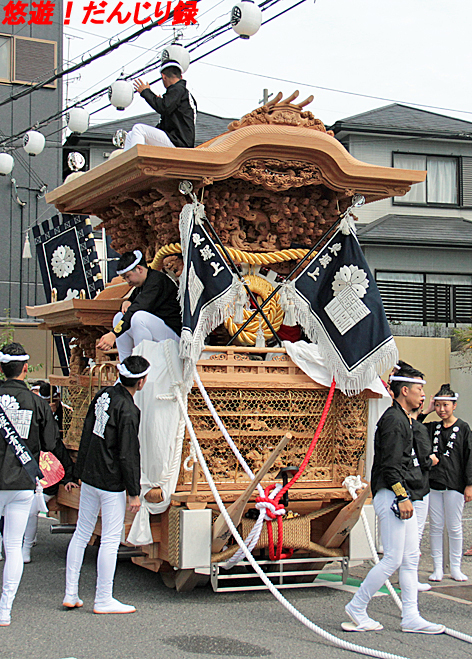午前6時過ぎに町内を出発しただんじりは泉北1号線を越えて野々宮神社へ宮入りし、神事のあと、午前8時に再び町内を出発して八田荘地区をお披露目曳行して回りました。