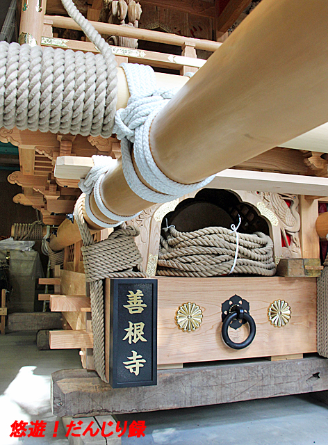 ここ善根寺のだんじりは一昨年の秋祭終了後に、平野区の《大市》河合工務店にて修復がなされ、昨年の祭礼前に完成しました。