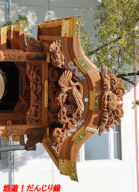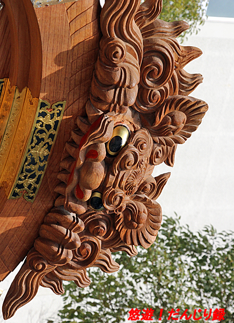 獅噛みは昭和の改修にて彫り替えられたものとして、新調当時の彫物と思えるのは正面車板の龍と大屋根虹梁の龍、そして後面車板の『楠公子別れ櫻井の驛』が当てはまると思われ(懸魚に関しては判断を保留)、一台のだんじりに実に三世代の彫物が同居するという形になっています。