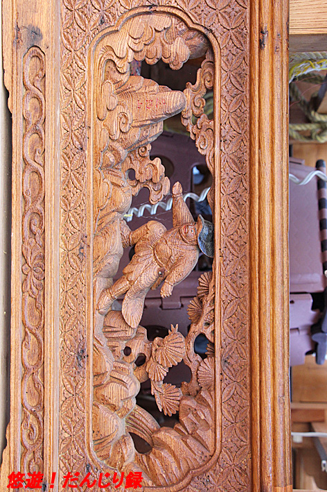 明らか『子供だんじり』には不釣り合いな、細やかな仕事の施された彫物が組み込まれてあります。