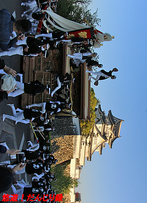 町会長の挨拶、曳行責任者による御神酒の献杯を経て、午前6時ほぼジャストに町内を出発しただんじりは、岸城神社へと向かうべくコナカラ坂を一家に駆け上がり、お城へ向けての遣り廻しで、あっと言う間に走り去ります。