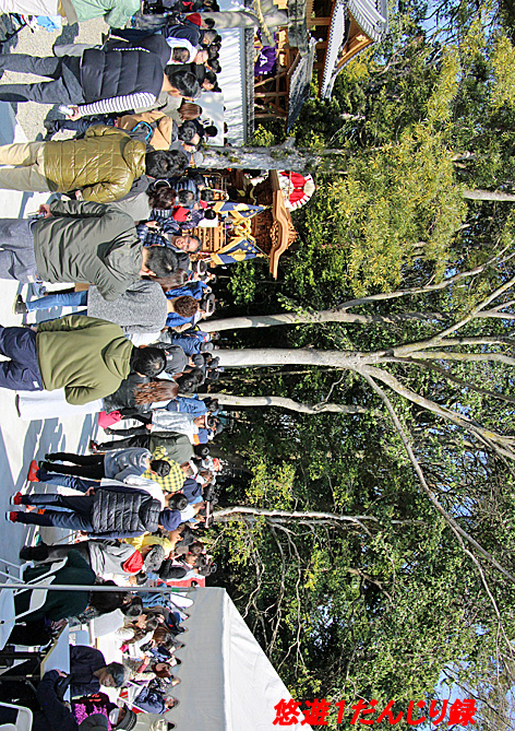 早朝には凍えるほど寒かったこの日でしたが、もうこの時間にはすっかり春の気候に包まれまして、穏やかな晴天のもと据え置かれただんじりを遠巻きに眺めながら、包近町は楠本神社を後にしました。