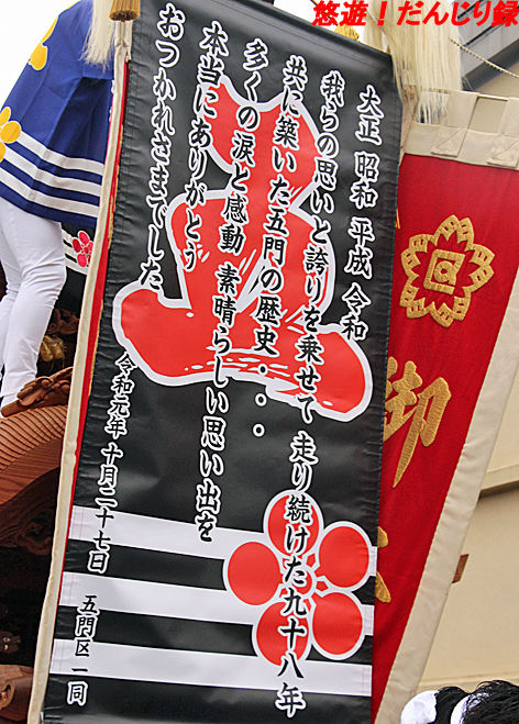 モチロンその当時は現在のような遣り廻しは行なっていなかったにせよ、大正から昭和、平成と、長きにわたり五門で愛されただんじりは、令和となって最初の年であるこの日、その役目を終える日が来ました。
